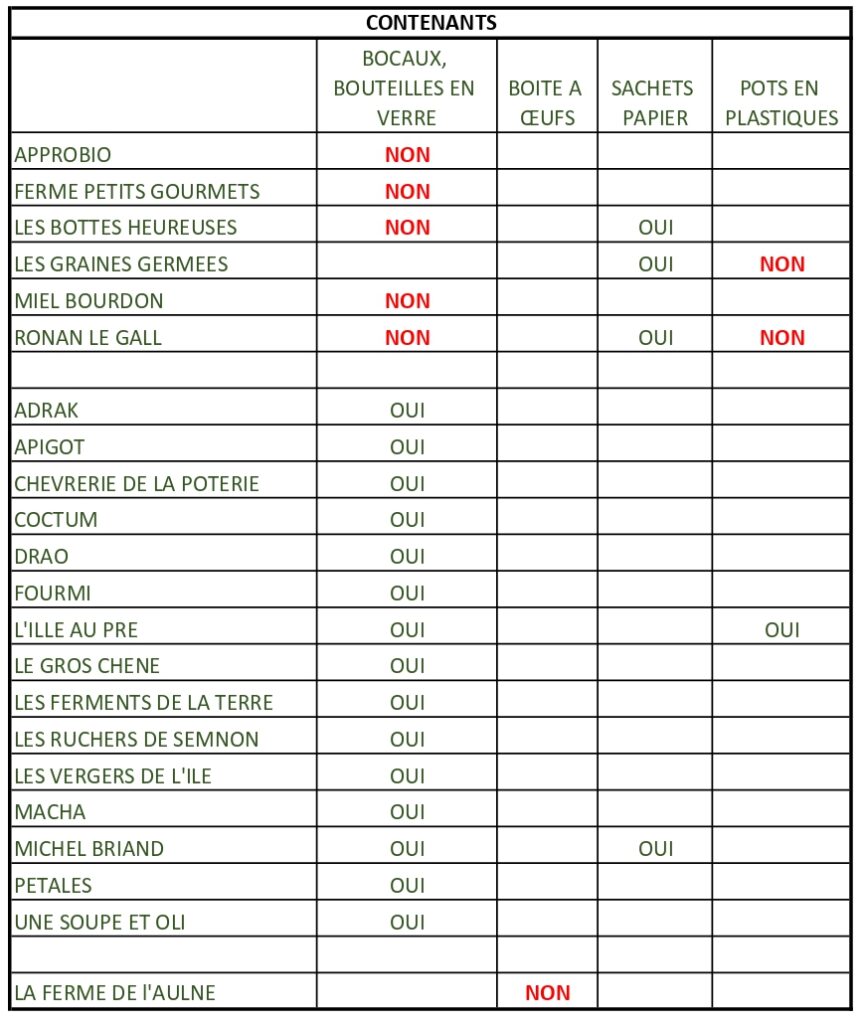 Dans cette démarche, certains producteurs reprennent leurs contenants vides et propres (liste dans tableau ci-dessous) afin de pouvoir les réutiliser ou les recycler. Un geste simple, écologique et cohérent avec les valeurs paysannes et locales que nous défendons.